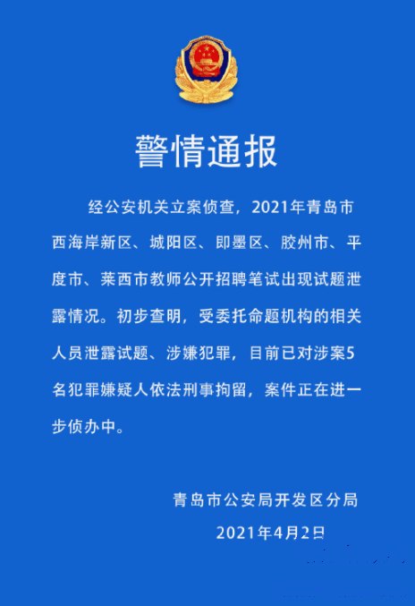 據青島開發(fā)區(qū)公安局4月2日消息,經公安機關立案偵查,2021年青島市西海岸新區(qū)、城陽區(qū)、即墨區(qū)、膠州市、平度市、萊西市教師公開招聘筆試出現試題泄露情況。初步查明,受委托命題機構的相關人員泄露試題、涉嫌犯罪,目前已對涉案5名犯罪嫌疑人依法刑事拘留,案件正在進一步偵辦中。