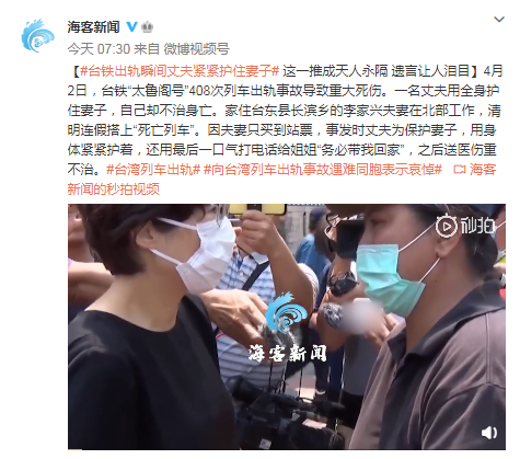 4月2日,臺(tái)鐵“太魯閣號(hào)”408次列車(chē)出軌事故導(dǎo)致重大死傷。一名丈夫用全身護(hù)住妻子,自己卻不治身亡。家住臺(tái)東縣長(zhǎng)濱鄉(xiāng)的李家興夫妻在北部工作,清明連假搭上“死亡列車(chē)”。因夫妻只買(mǎi)到站票,事發(fā)時(shí)丈夫?yàn)楸Wo(hù)妻子,用身體緊緊護(hù)著,還用最后一口氣打電話(huà)給姐姐“務(wù)必帶我回家”,之后送醫(yī)傷重不治。