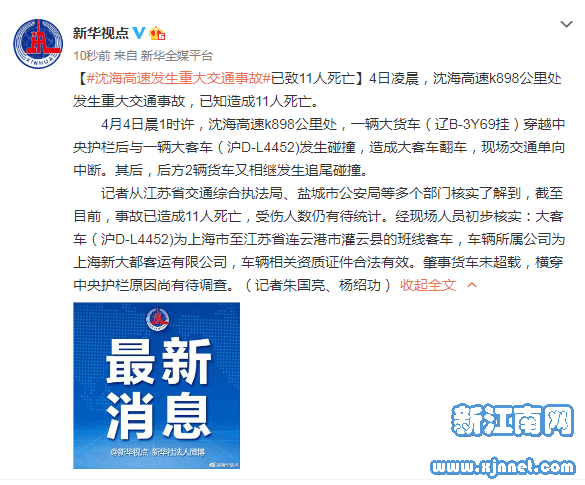 【沈海高速發(fā)生重大交通事故 已致11人死亡】4日凌晨,沈海高速k898公里處發(fā)生重大交通事故,已知造成11人死亡。