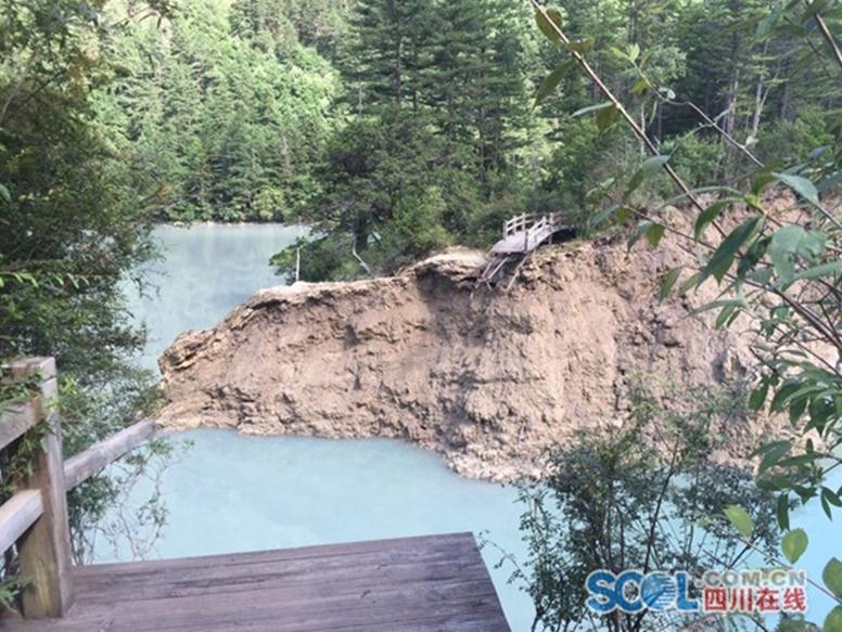 8日晚地震后,九寨溝景區(qū)火花海子壩體產(chǎn)生缺口,缺口寬20米,長(zhǎng)約50米。隨后,火花海的下泄流量從正常的9.3立方米/秒,快速增加到最大時(shí)21.5立方米/秒。至9日晨,火花海內(nèi)水量已經(jīng)基本放空。阿壩州防指相關(guān)負(fù)責(zé)人介紹,目前當(dāng)?shù)卣诿芮嘘P(guān)注景區(qū)內(nèi)其他海子情況。圖為火花,F(xiàn)狀。