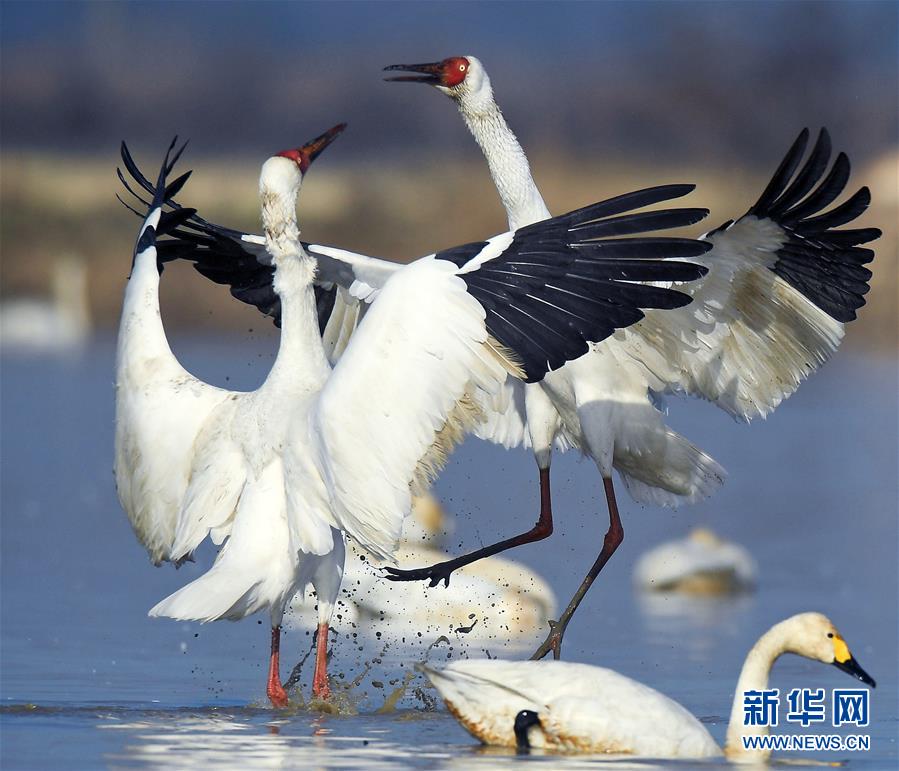 1月11日,兩只白鶴在鄱陽(yáng)湖畔的五星農(nóng)場(chǎng)嬉戲打鬧。在江西省南昌市鄱陽(yáng)湖邊的五星農(nóng)場(chǎng),來(lái)此越冬的國(guó)家一級(jí)保護(hù)鳥(niǎo)類(lèi)白鶴展翅起舞,姿態(tài)萬(wàn)千。 新華社記者 萬(wàn)象 攝