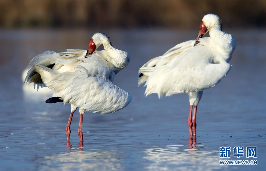 1月11日,兩只白鶴在鄱陽(yáng)湖畔的五星農(nóng)場(chǎng)梳理羽毛。在江西省南昌市鄱陽(yáng)湖邊的五星農(nóng)場(chǎng),來(lái)此越冬的國(guó)家一級(jí)保護(hù)鳥(niǎo)類(lèi)白鶴展翅起舞,姿態(tài)萬(wàn)千。 新華社記者 萬(wàn)象 攝
