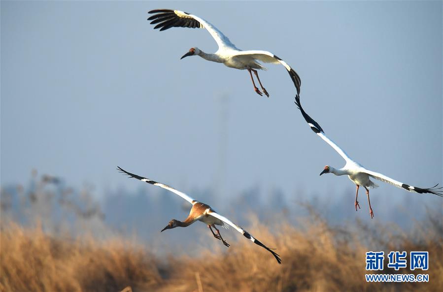1月11日,白鶴在位于鄱陽(yáng)湖畔的五星農(nóng)場(chǎng)上空飛翔。在江西省南昌市鄱陽(yáng)湖邊的五星農(nóng)場(chǎng),來(lái)此越冬的國(guó)家一級(jí)保護(hù)鳥(niǎo)類(lèi)白鶴展翅起舞,姿態(tài)萬(wàn)千。 新華社記者 萬(wàn)象 攝