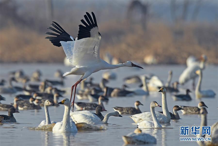 1月11日,一只白鶴在位于鄱陽(yáng)湖畔的五星農(nóng)場(chǎng)的濕地中飛翔。在江西省南昌市鄱陽(yáng)湖邊的五星農(nóng)場(chǎng),來(lái)此越冬的國(guó)家一級(jí)保護(hù)鳥(niǎo)類(lèi)白鶴展翅起舞,姿態(tài)萬(wàn)千。 新華社記者 萬(wàn)象 攝