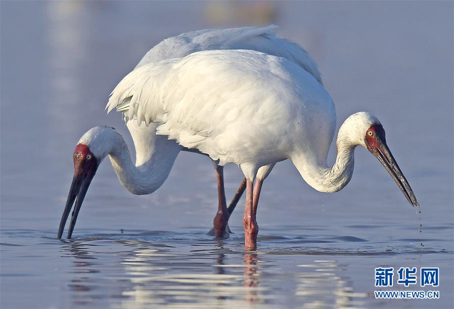 1月11日,在位于鄱陽(yáng)湖畔的五星農(nóng)場(chǎng),兩只白鶴在濕地中覓食。在江西省南昌市鄱陽(yáng)湖邊的五星農(nóng)場(chǎng),來(lái)此越冬的國(guó)家一級(jí)保護(hù)鳥(niǎo)類(lèi)白鶴展翅起舞,姿態(tài)萬(wàn)千。 新華社記者 萬(wàn)象 攝