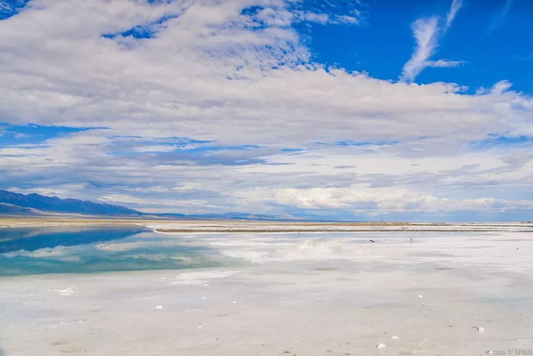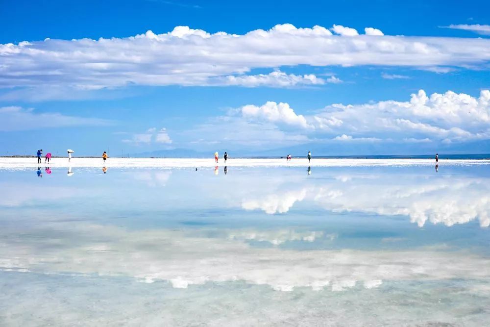 7月份是前往茶卡鹽湖是最好的季節(jié)。湖面鹽水清澈透亮,如雪原般晶瑩,來到這里,你才能體到什么叫真正的“海天一色”。仿佛走進了世界的盡頭,如夢如幻。