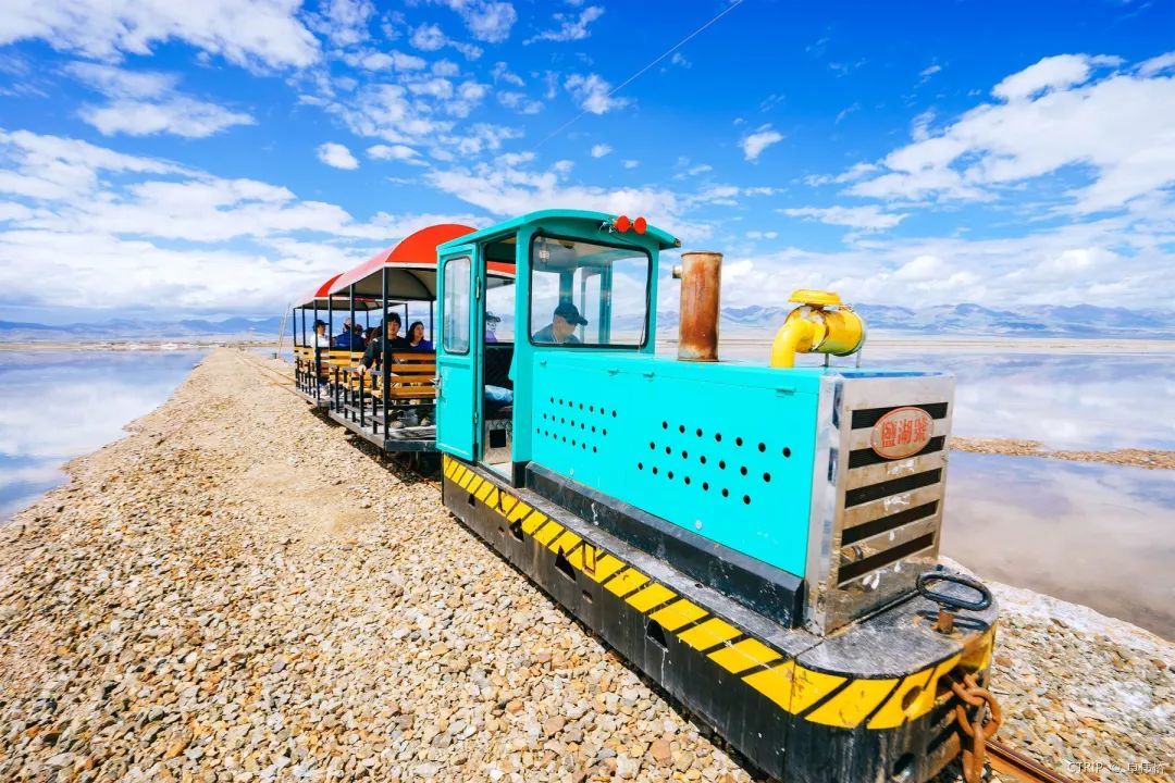 蜿蜒著伸向湖心的鐵路,坐上小火車去往湖心深處,踩一腳潔白的鹽沙,將倒影放進這如鏡的湖面。入夜后的的天空和腳下又是一片星辰璀璨。