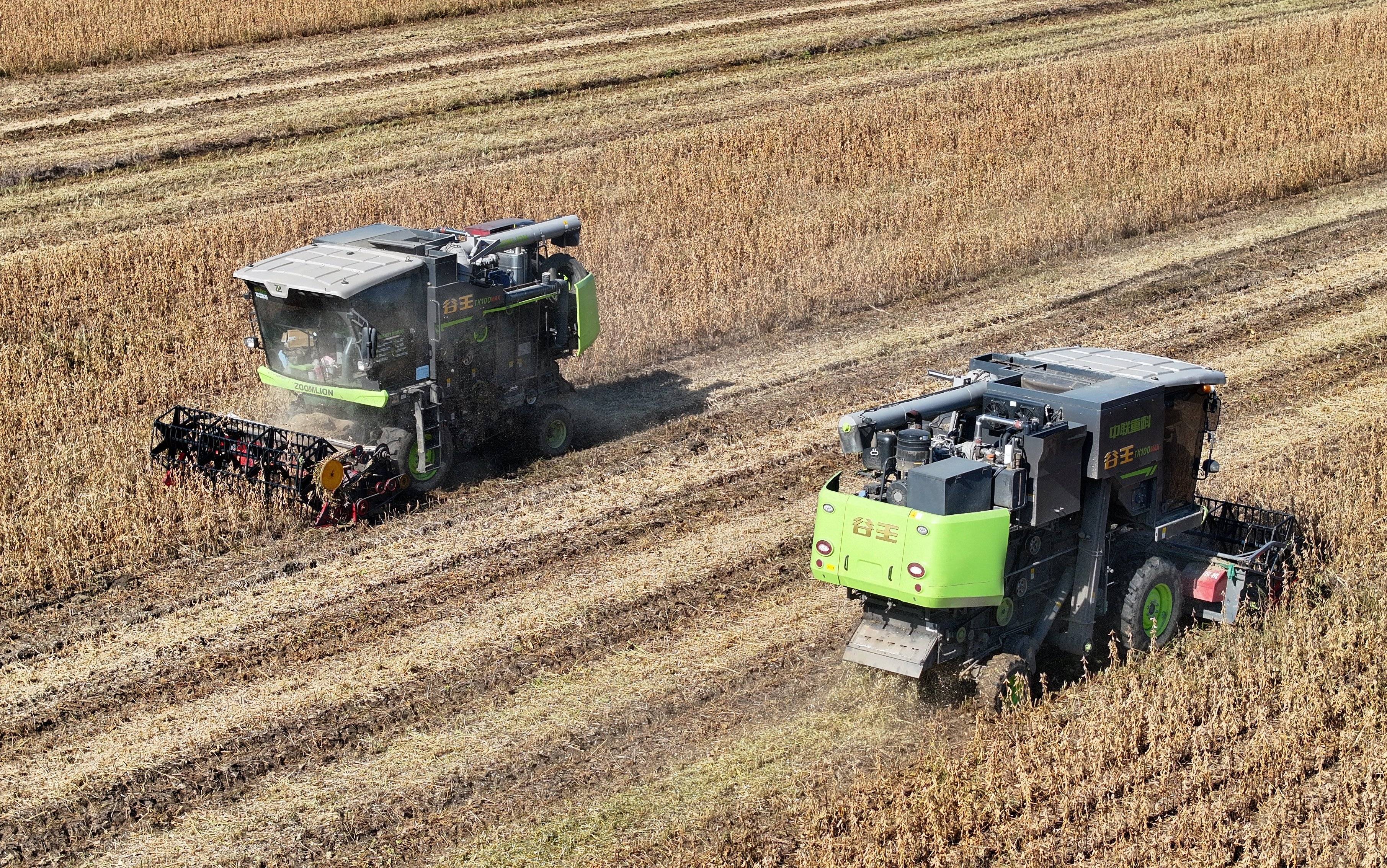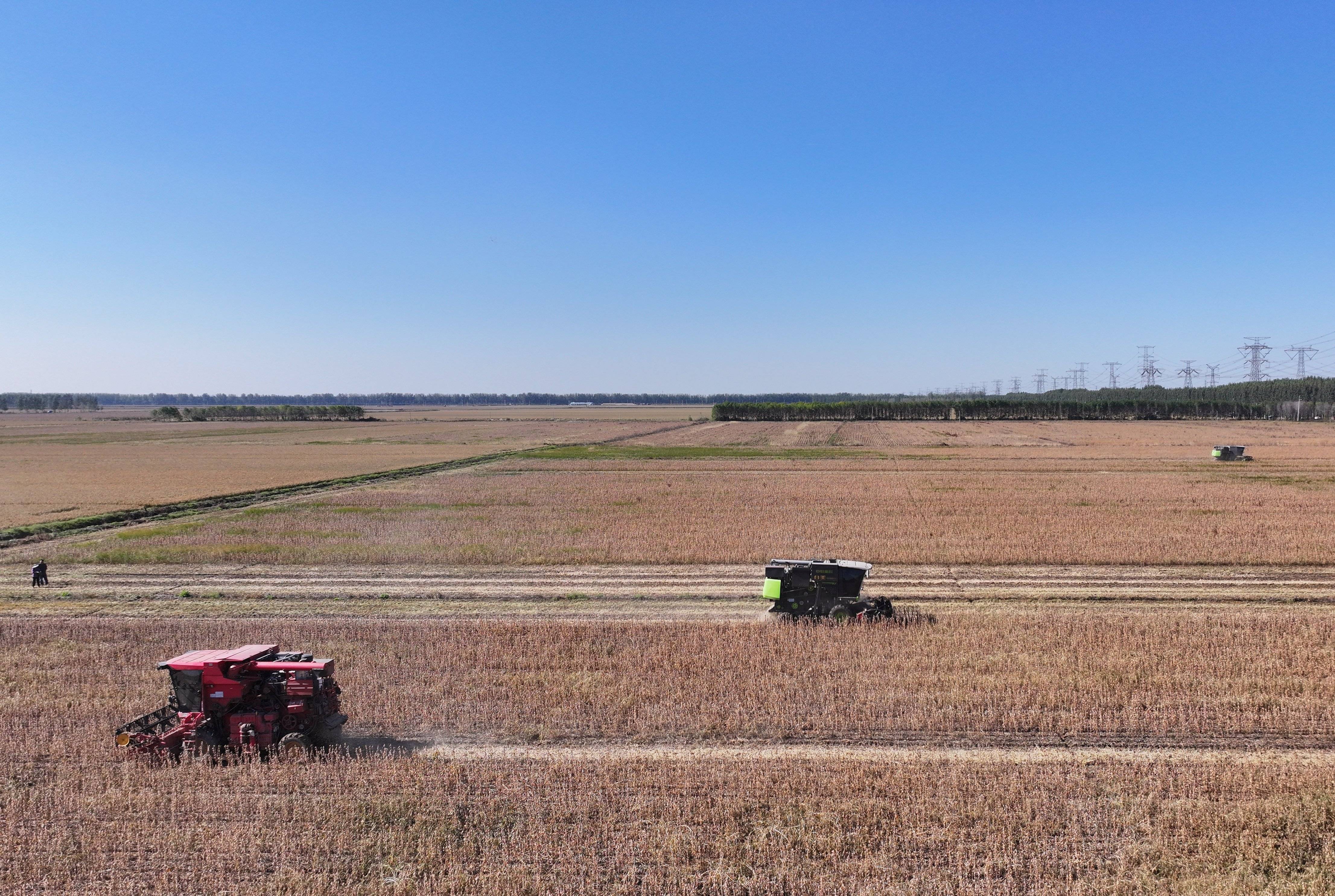 10月21日,收割機在天津市薊州區(qū)下窩頭鎮(zhèn)收獲大豆(無人機照片)。 新華社記者 李然 攝